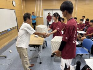OBOG戦は雨天中止となりましたが、筑紫高校視聴覚室において支援物品の贈呈、現役生向け講習会を行いました。 現役大学生、社会人から語られる体験談やアドバイス、戦術など、現役生は熱心に聴講しました。